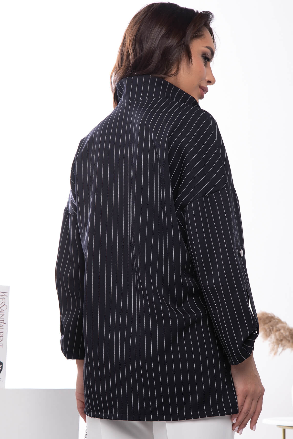 Рубашка, как базовая вещь, отлично дополнит любой образ: офисный, деловой или повседневный. Может стать частью многослойного образа или изюминкой комплекта с брюками или джинсами. Рубашка свободного кроя с отрезной кокеткой. Рукав втачной, три четверти. Воротник-стойка, без застёжки, украшена декоративной лентой.
