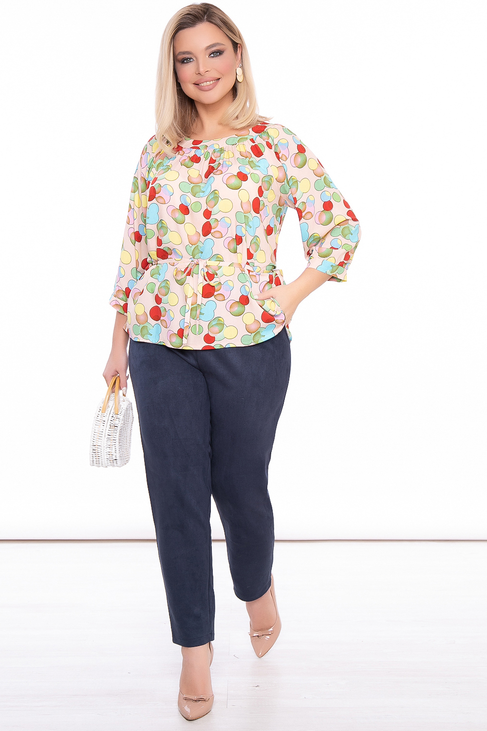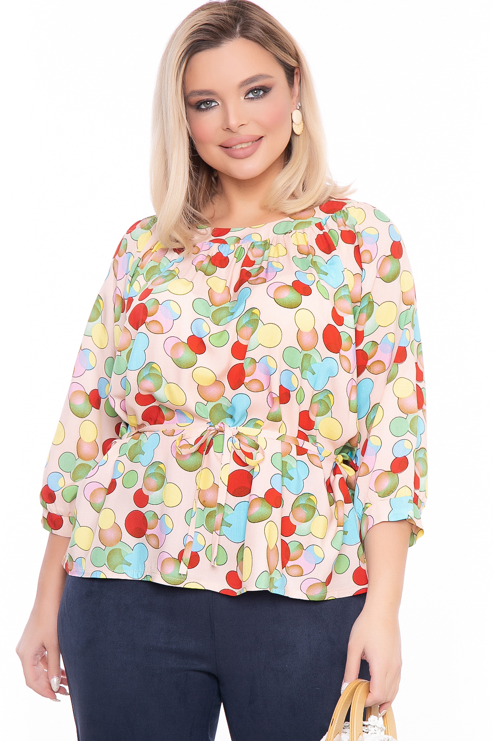 Очаровательная лёгкая блуза свободного кроя с завязками на талии. Округлый вырез горловины. Рукав втачной, три четверти, на манжете. Яркий принт - отличное решение для сезона весна-лето 2022!