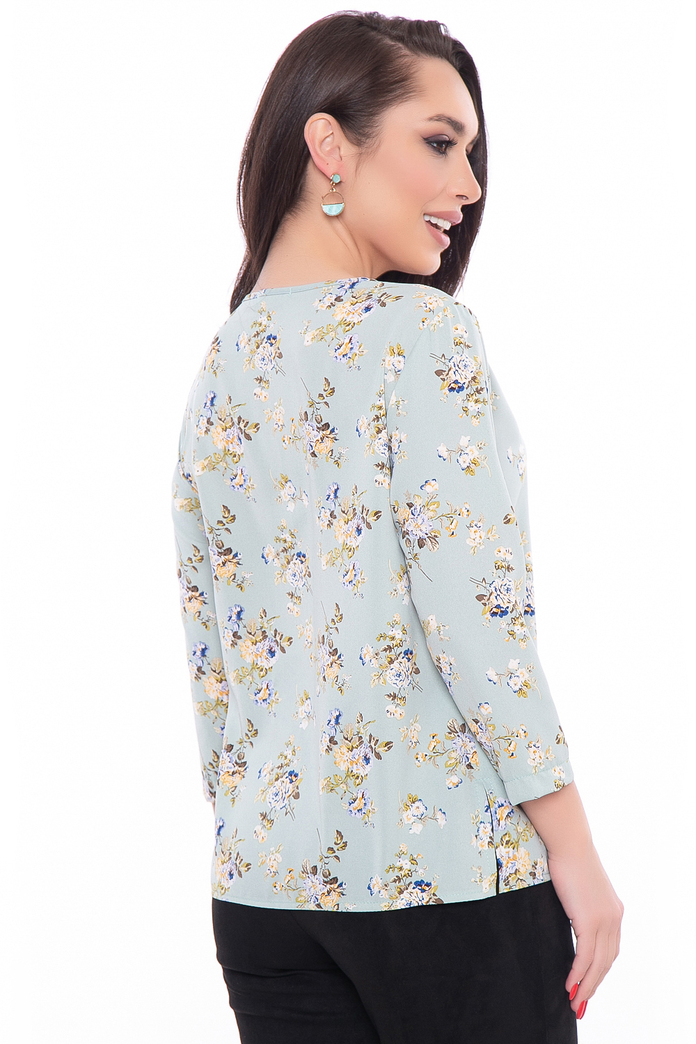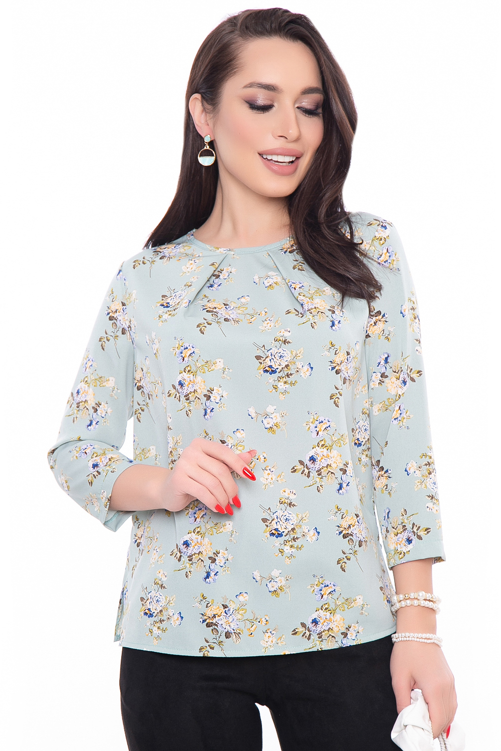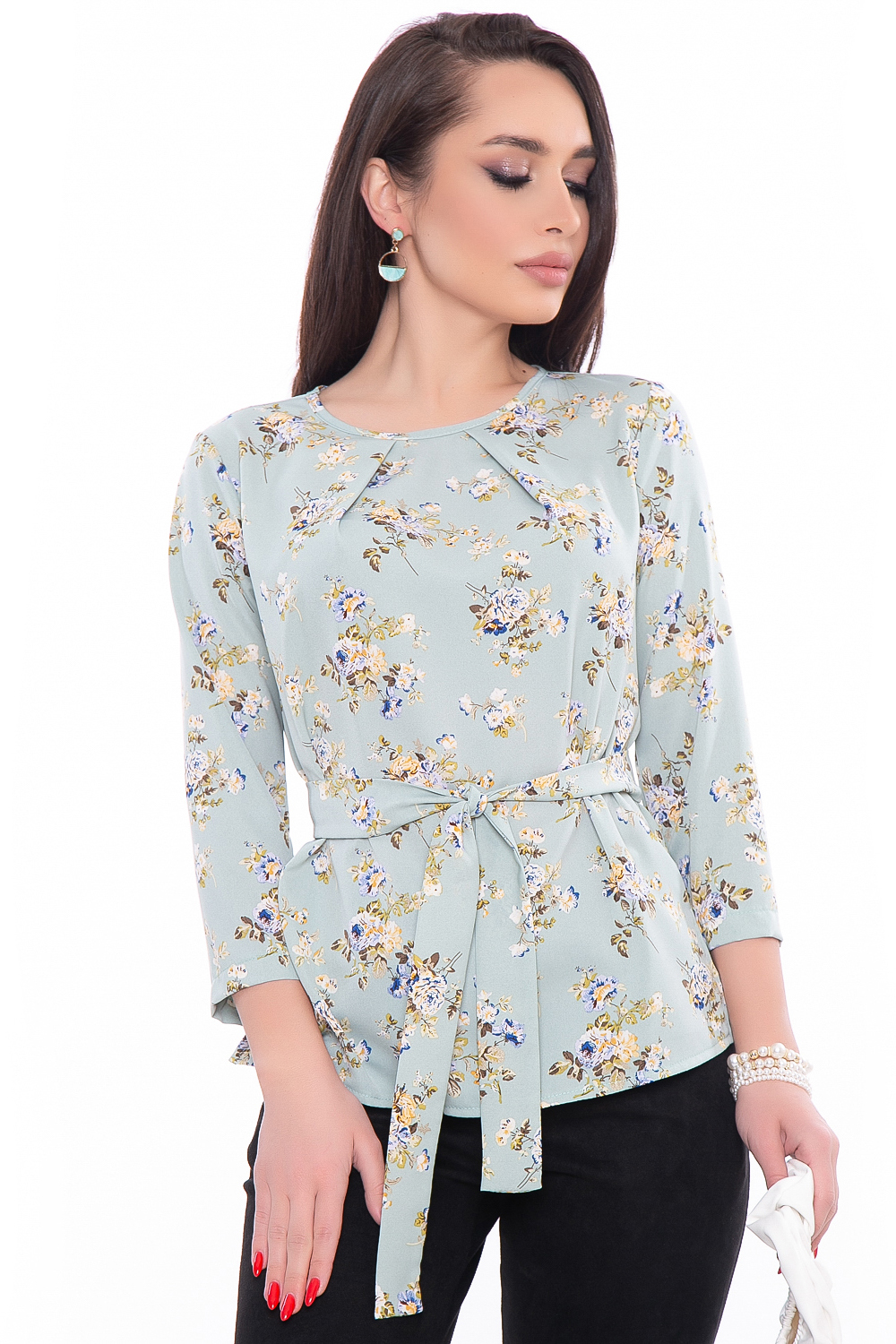 Классическая блуза в нежном оттенке с цветочным принтом. Свободного кроя с защипами по переду, классический округлый вырез горловины, рукав втачной, три четвертых. В комплекте тканевый поясок, по бокам разрезы.