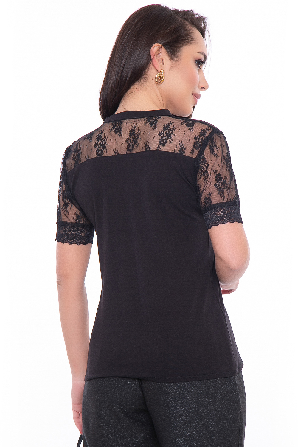 - Базовая блуза прилегающего силуэта со вставками из эластичного гипюра;