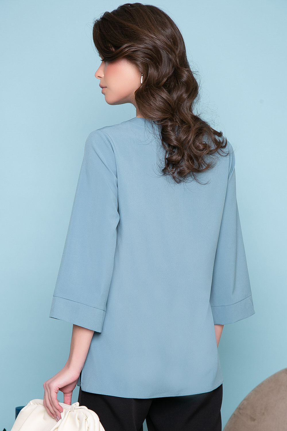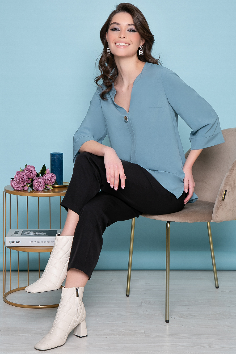 Блуза для создания элегантных классических и вечерних образов. Изящный V-образный вырез горловины украшен золотой пуговицей. Рукав втачной, три четверти, на широкой манжете. По бокам блузы разрезы.