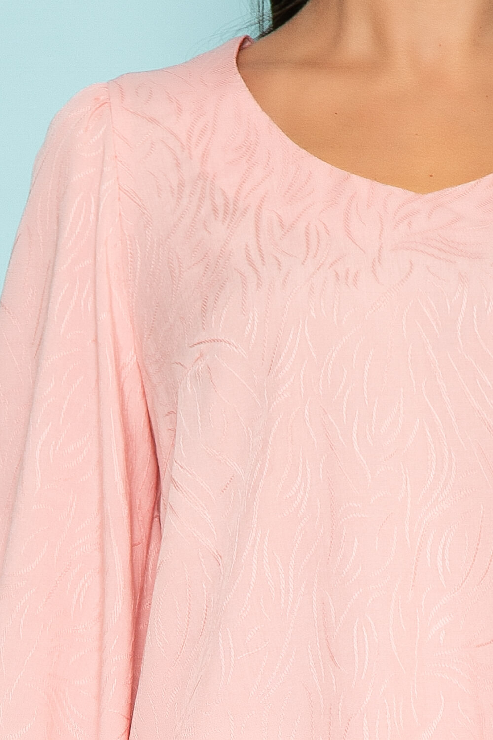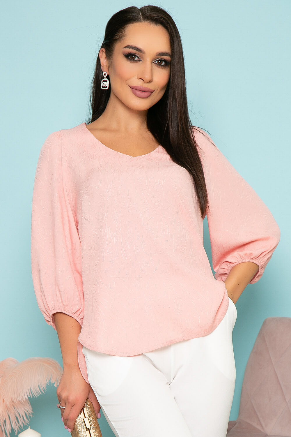 Блуза А-силуэта в женственном исполнении из вискозы. Мягкий V-образный вырез горловины красиво подчеркнёт зону декольте. Низ блузы закруглён, окантован, спинка удлинена. Рукав втачной, укороченный, по низу на резинке. Блуза прекрасно подойдёт к офисному гардеробу, а также легко впишется в повседневный.