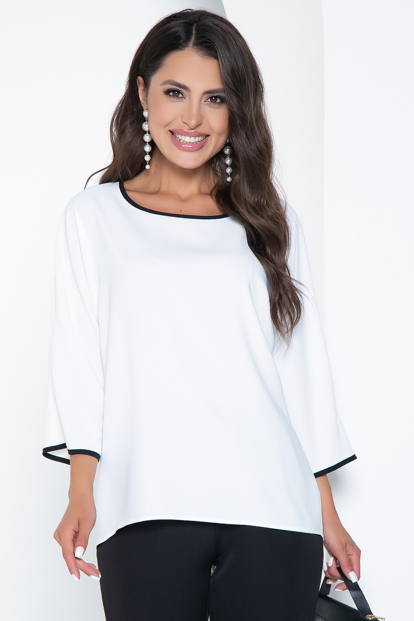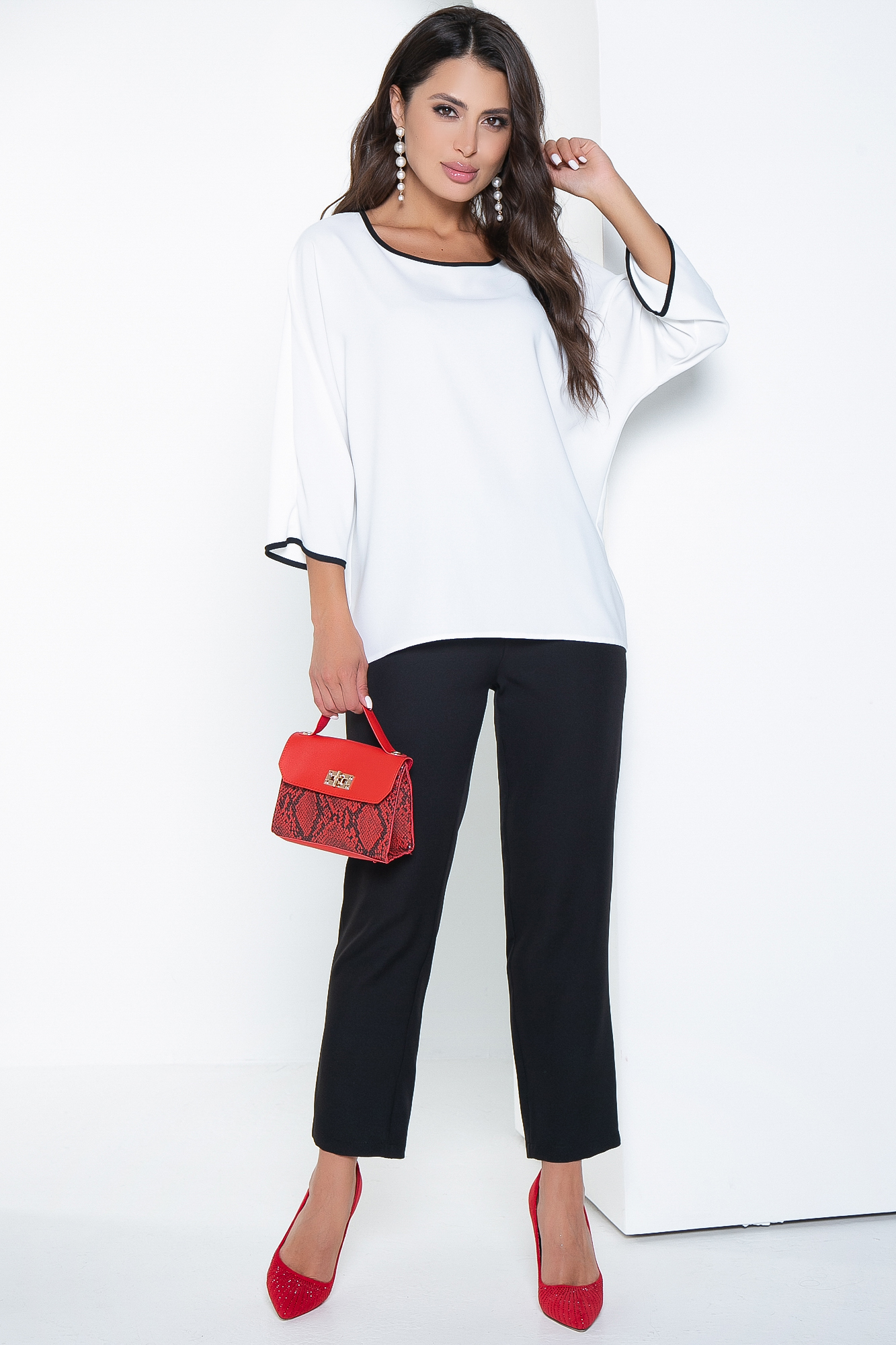 Классическая блуза белого цвета прекрасно дополнит Ваш базовый гардероб. Поясок в комплекте. Комбинируйте блузу с юбками и брюками, создавая новые образы на каждый день! Блуза свободного кроя, вырез горловины округлый, обработан черной окантовкой. Рукав цельнокроеный, фасон "летучая мышь", семь восьмых. Рукав широкий, низ так же обработан черным кантом.