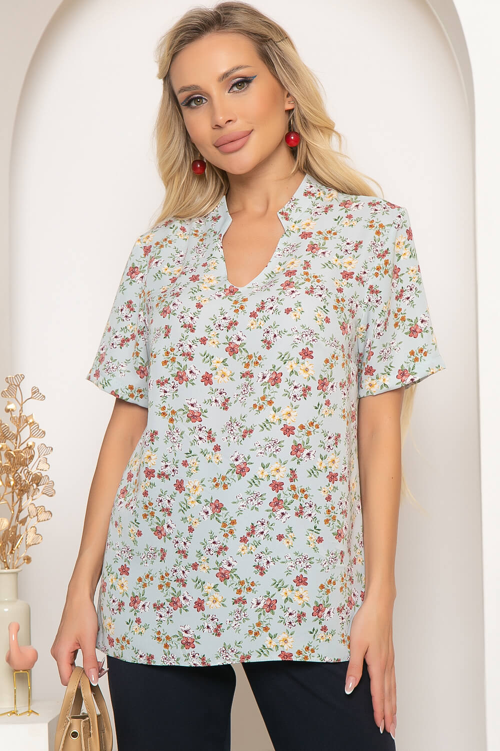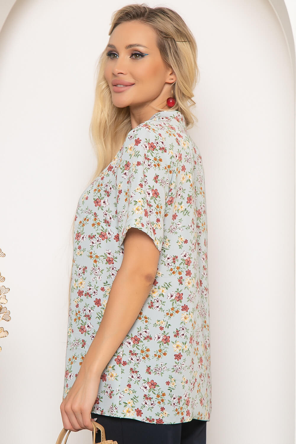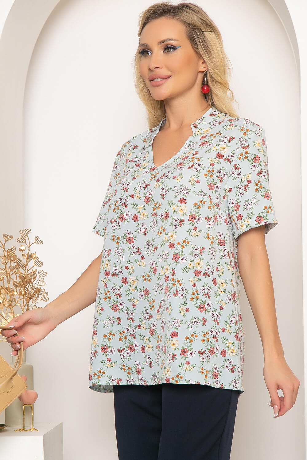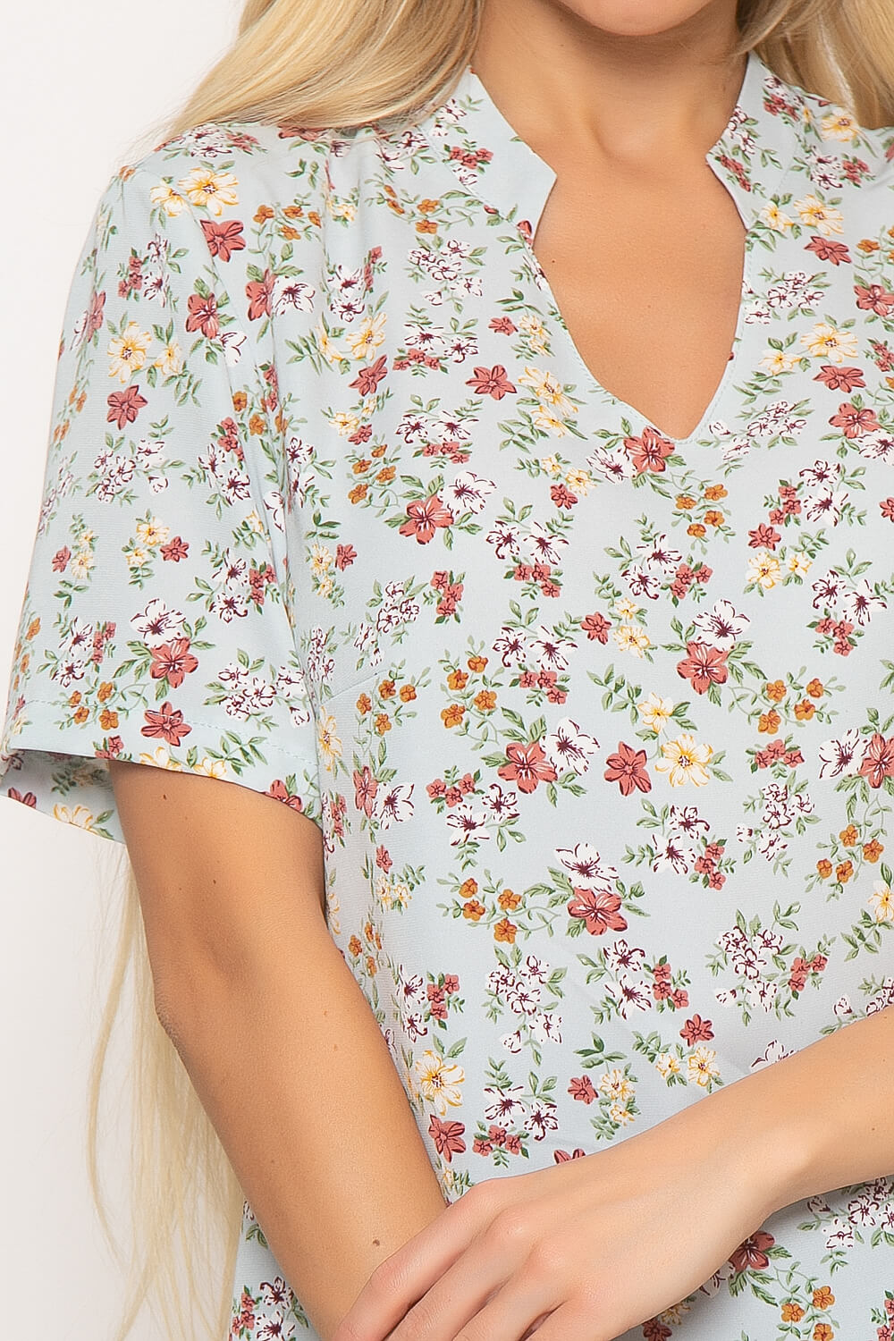 Классическая блуза с нежным цветочным принтом и воротником-стойкой легко впишется в Ваш гардероб, добавит образу женственности и элегантности. Блуза свободного кроя с акцентным фигурным воротником-стойкой. Рукав втачной, короткий.