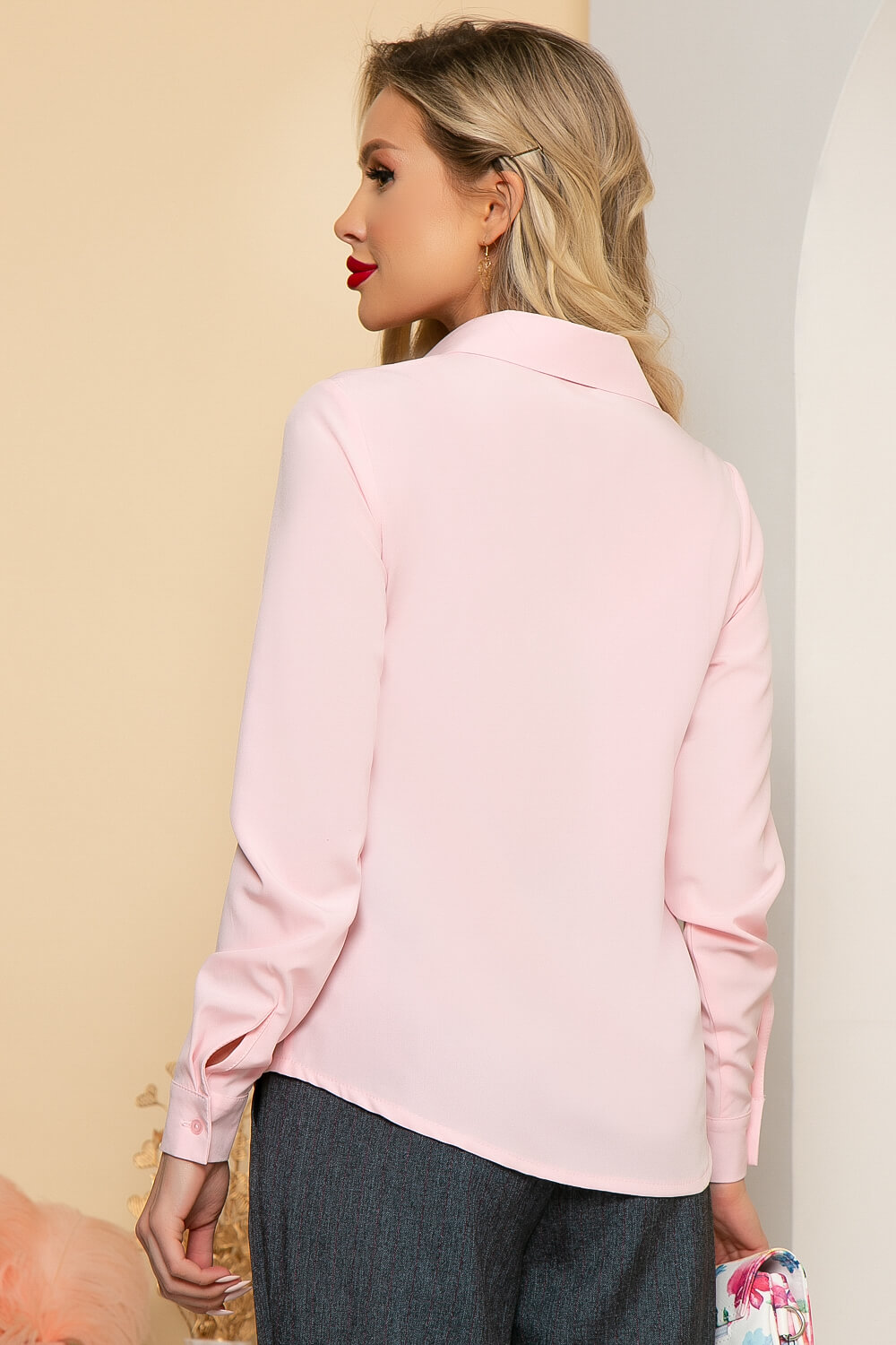 Блуза полуприлегающего силуэта, выполненная из приятной к телу ткани, в красивом розовом оттенке, который хорошо будет сочетаться с Вашим деловым гардеробом. Рукав втачной, длинный, низ рукава на манжете. Спинка скруглена.