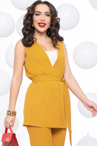 Элегантный костюм, состоящий из брюк и жилета, идеально будет смотреться, как в повседневной жизни, так и на деловой встрече. Жилет можно дополнить поясом из основной ткани, который идет в комплекте. С поясом образ получится более утонченный. Жилет без подкладки и без карманов. Брюки классические по талии на резинке.