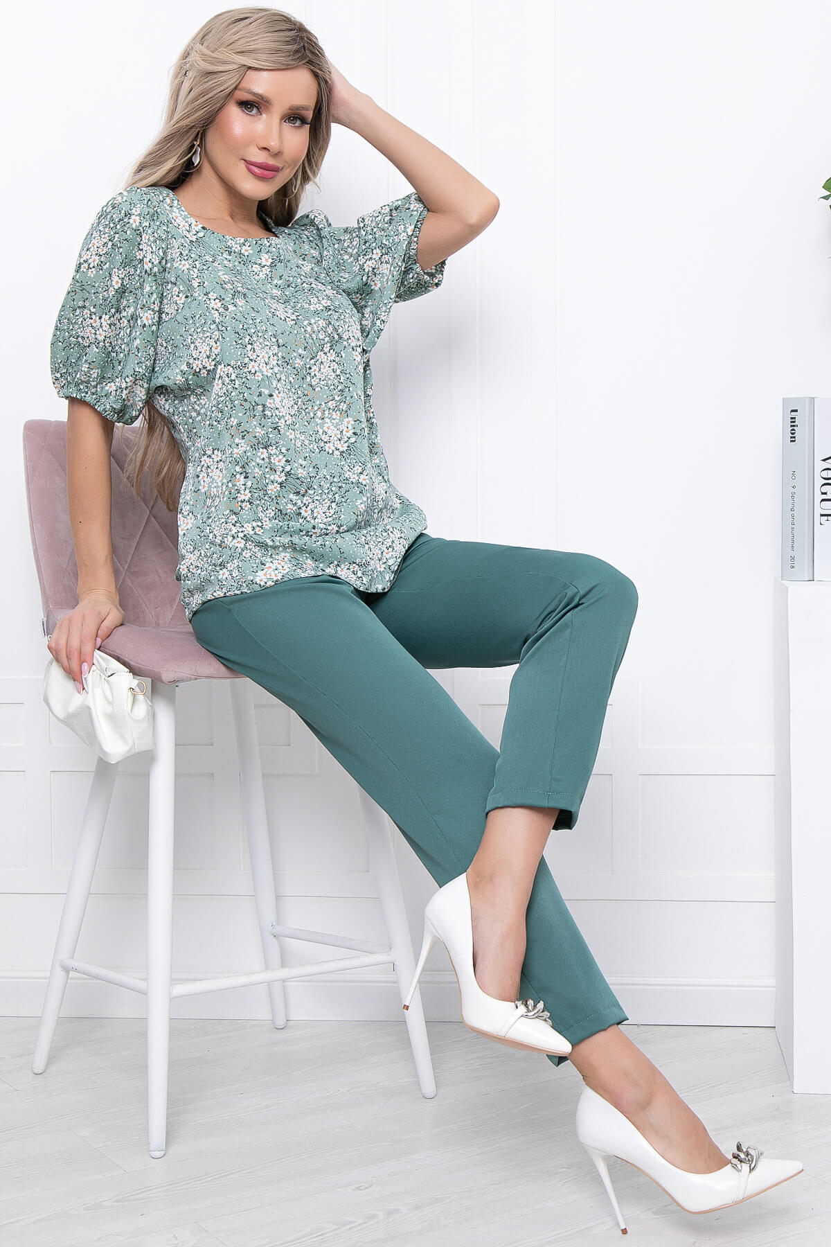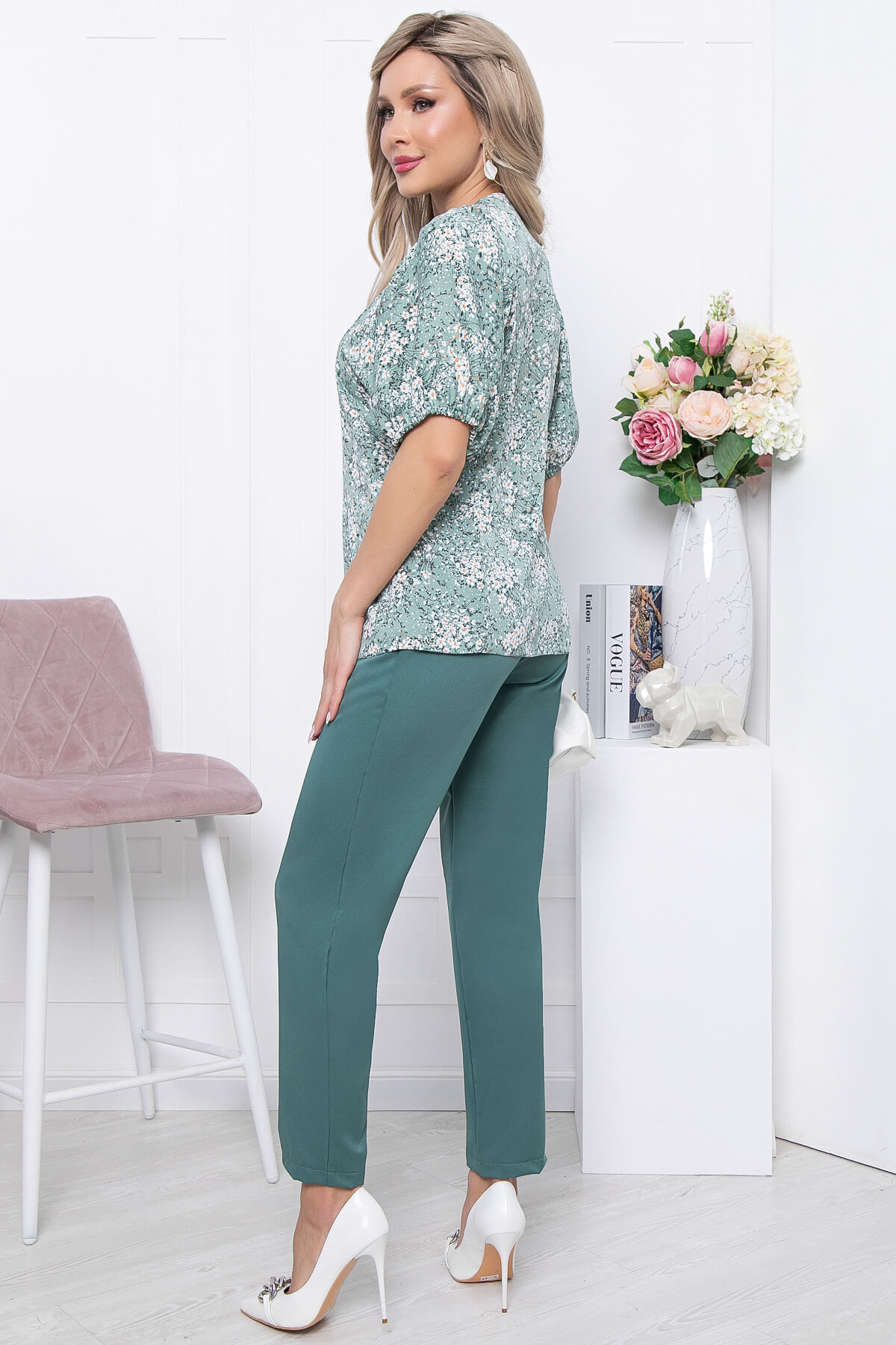 Элегантный костюм, состоящий из брюк с высокой посадкой на резинке и блузы свободного кроя с акцентными рукавами. Очень женственный комплект с милым флористическим принтом. Блуза свободного кроя, округлый вырез горловины, рукав три четверти, втачной, по форме напоминает "фонарик".