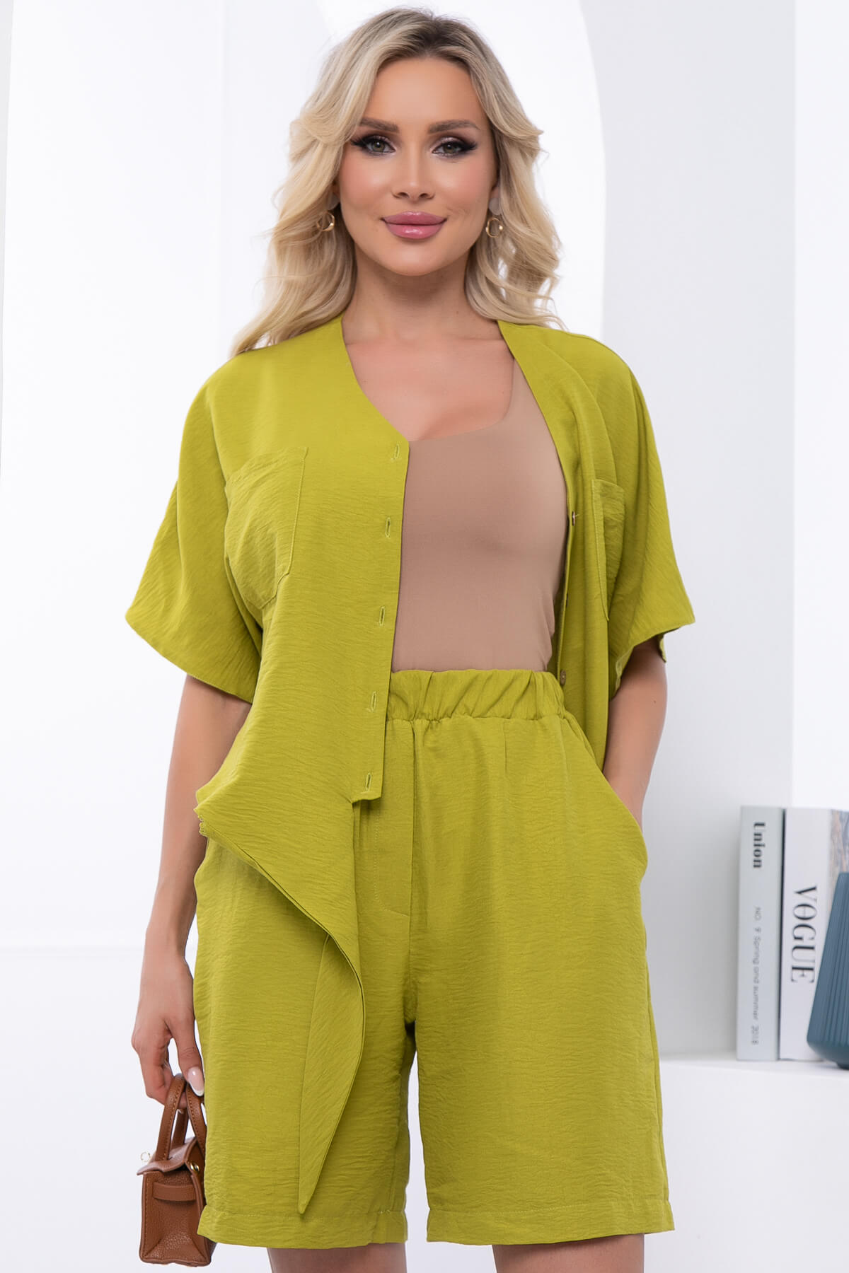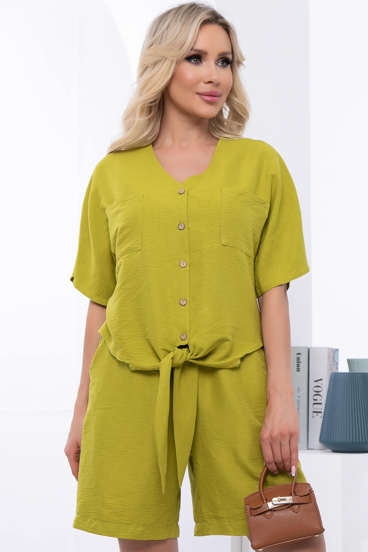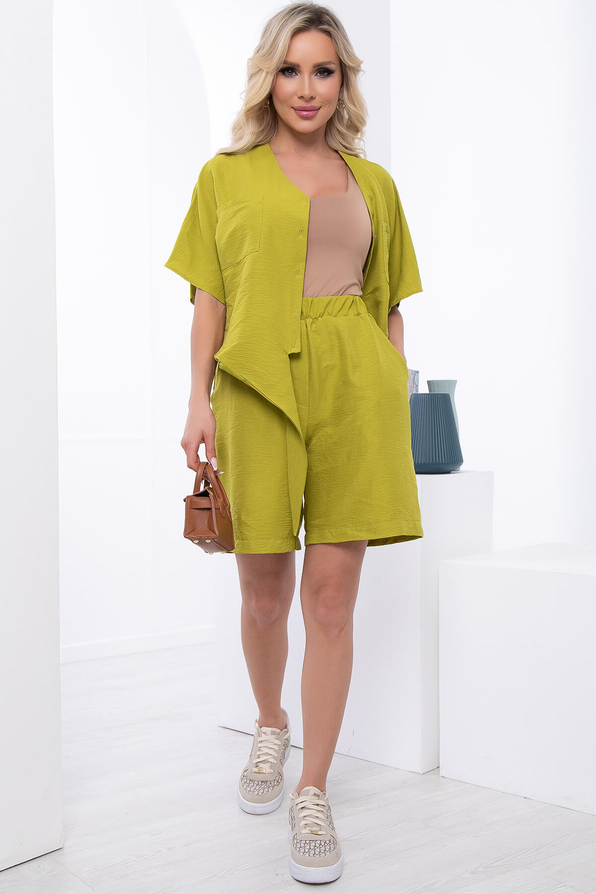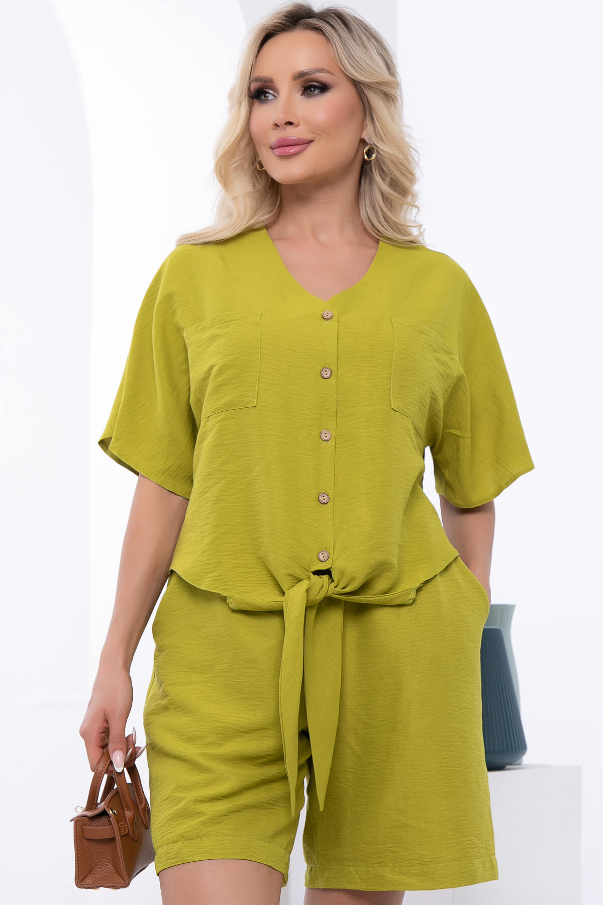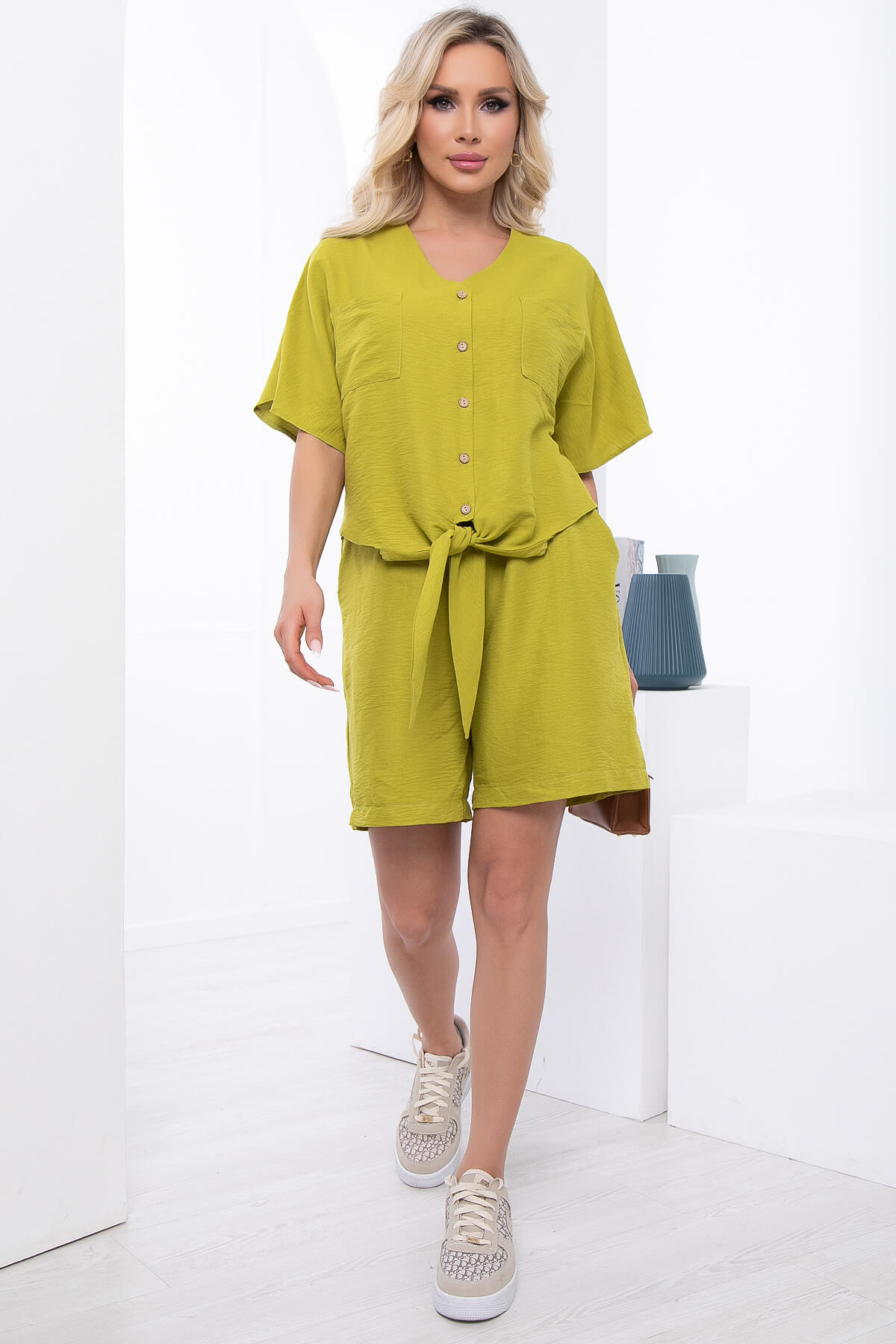 Идеальный тренд для тех, кто всегда в поисках стильных и модных, а главное удобных образов на лето! На пике популярности в этом сезоне комплект из свободной рубашки и прямых шорт. Рубашка свободного кроя на пуговицах с акцентными завязками по низу. Рукав укороченный, цельнокроенный. Шорты классические на резинке, есть карманы.