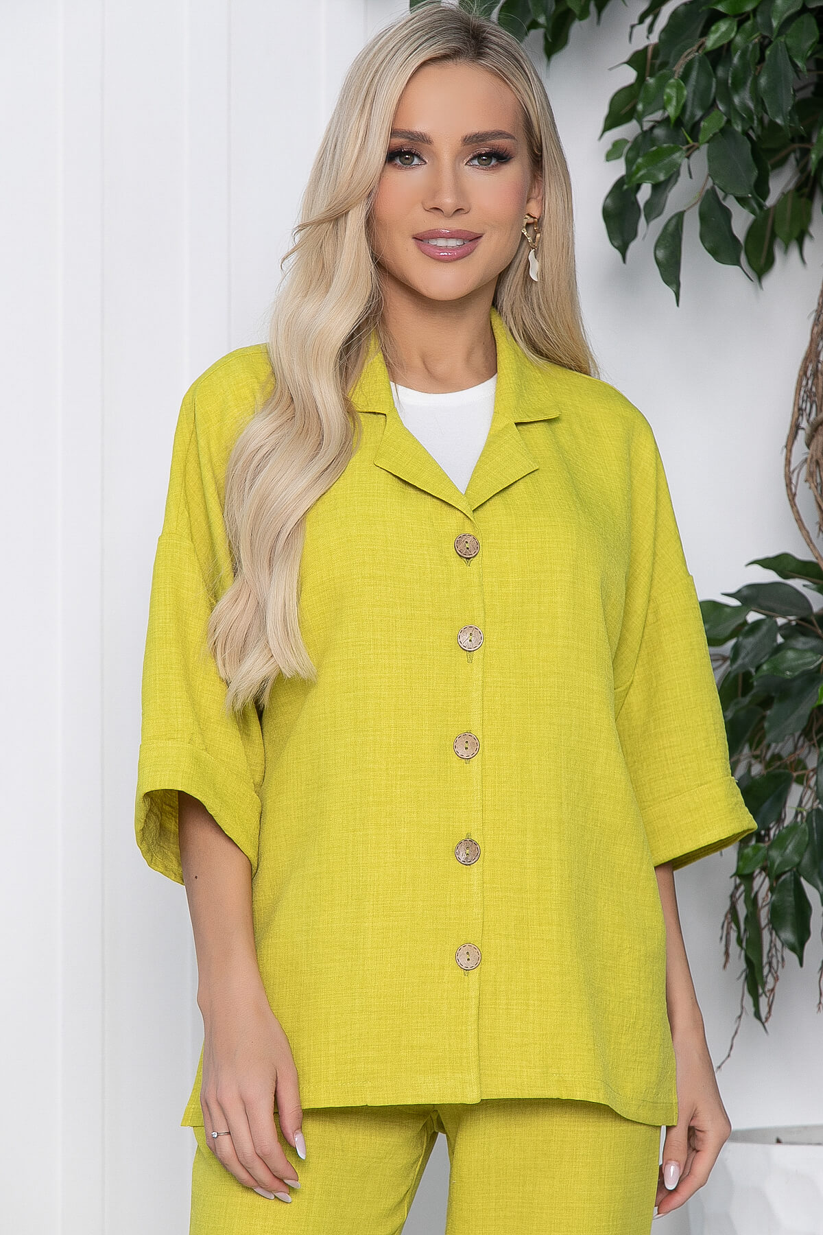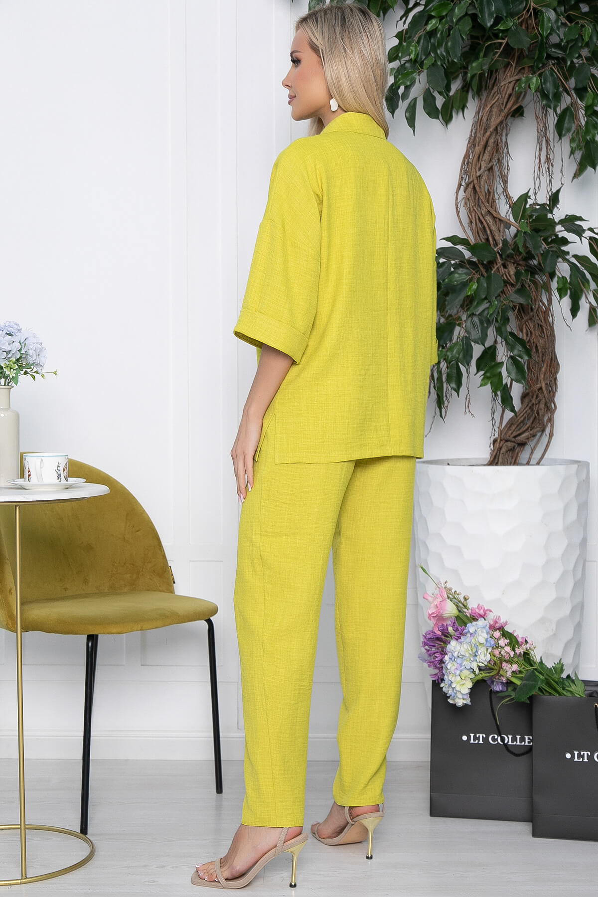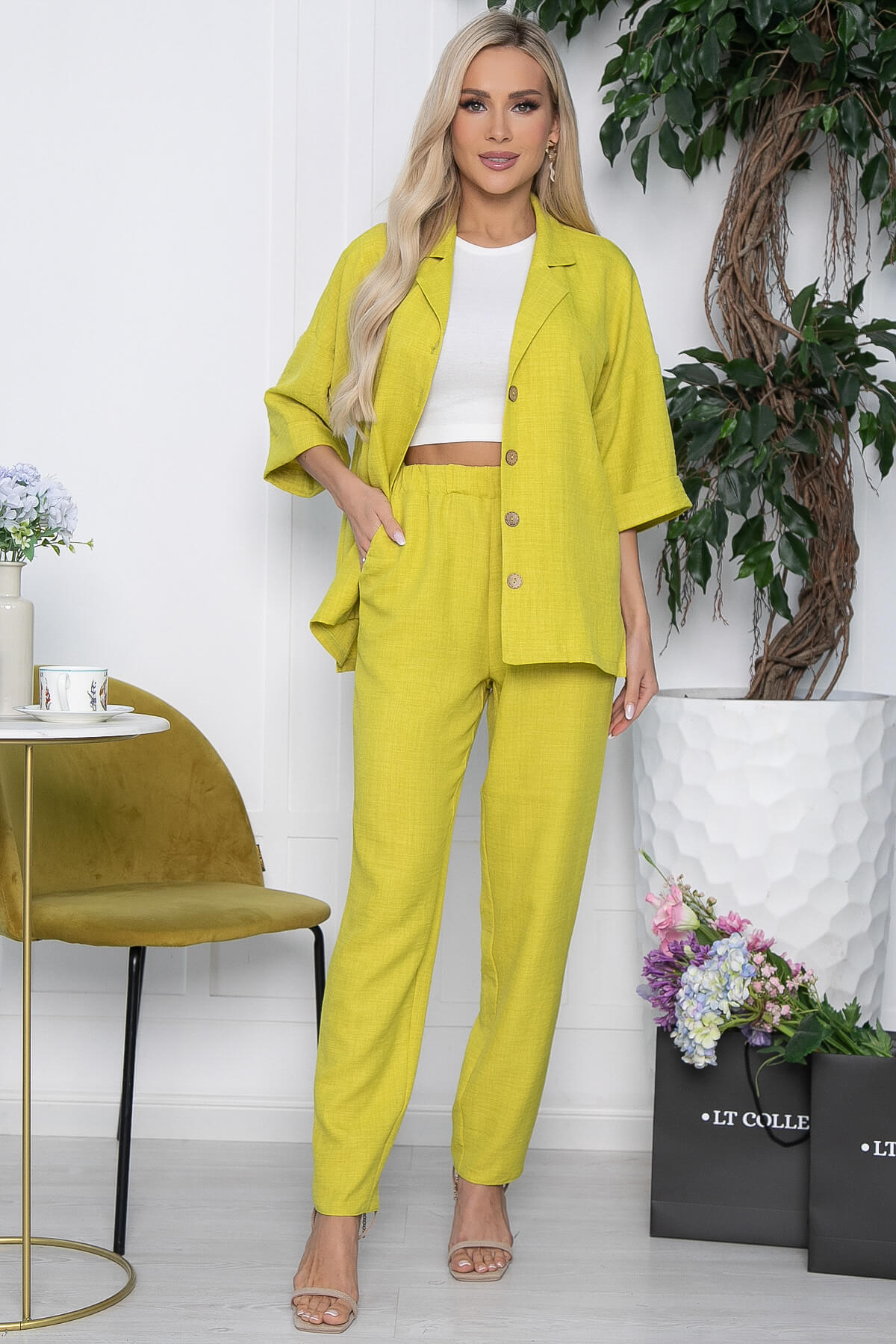 Летний брючный костюм из легкой ткани – один из лучших вариантов в жаркую погоду! В нём вы будете себя чувствовать уверенно и комфортно. Можно носить совместно так и раздельно. Этот брючный костюм подойдет как для дома, так и для выхода на пляж или вечернее мероприятие. Жакет свободного кроя на пуговицах, рукав 3/4 спущенный на манжете. Брюки полуприлегающего силуэта на резинке, есть карманы.