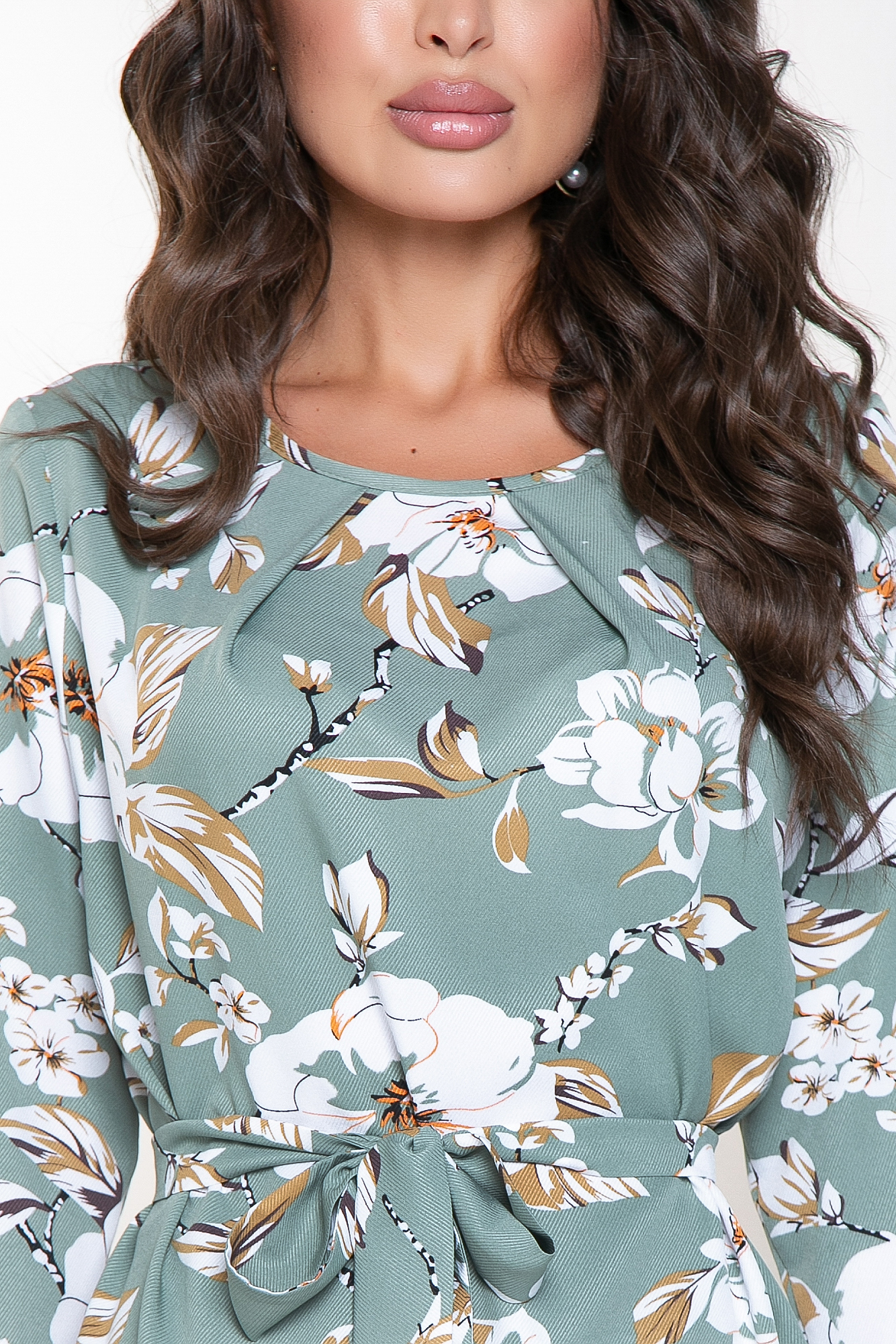 - Блуза свободного кроя, вырез горловины круглый, с защипами по переду. Рукав втачной 3/4. В комплекте тканевый поясок;