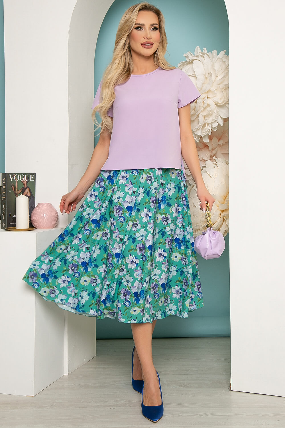 Очаровательный костюм из двух предметов: летящей юбки и блузы. Блуза свободного кроя. Мягкий, округлый вырез горловины, рукав короткий, втачной. По бокам разрезики, спинка удлинена. Юбка с высокой посадкой, на резинке, А-силуэта.