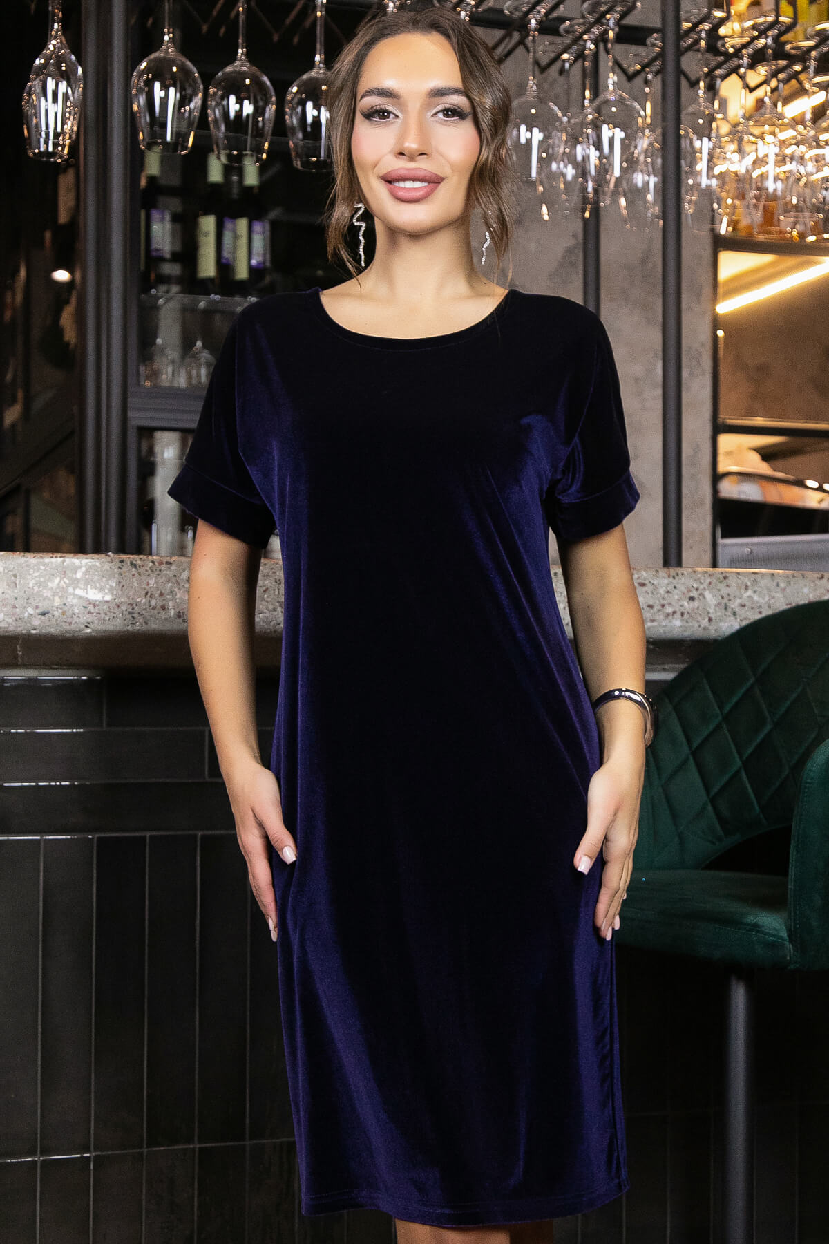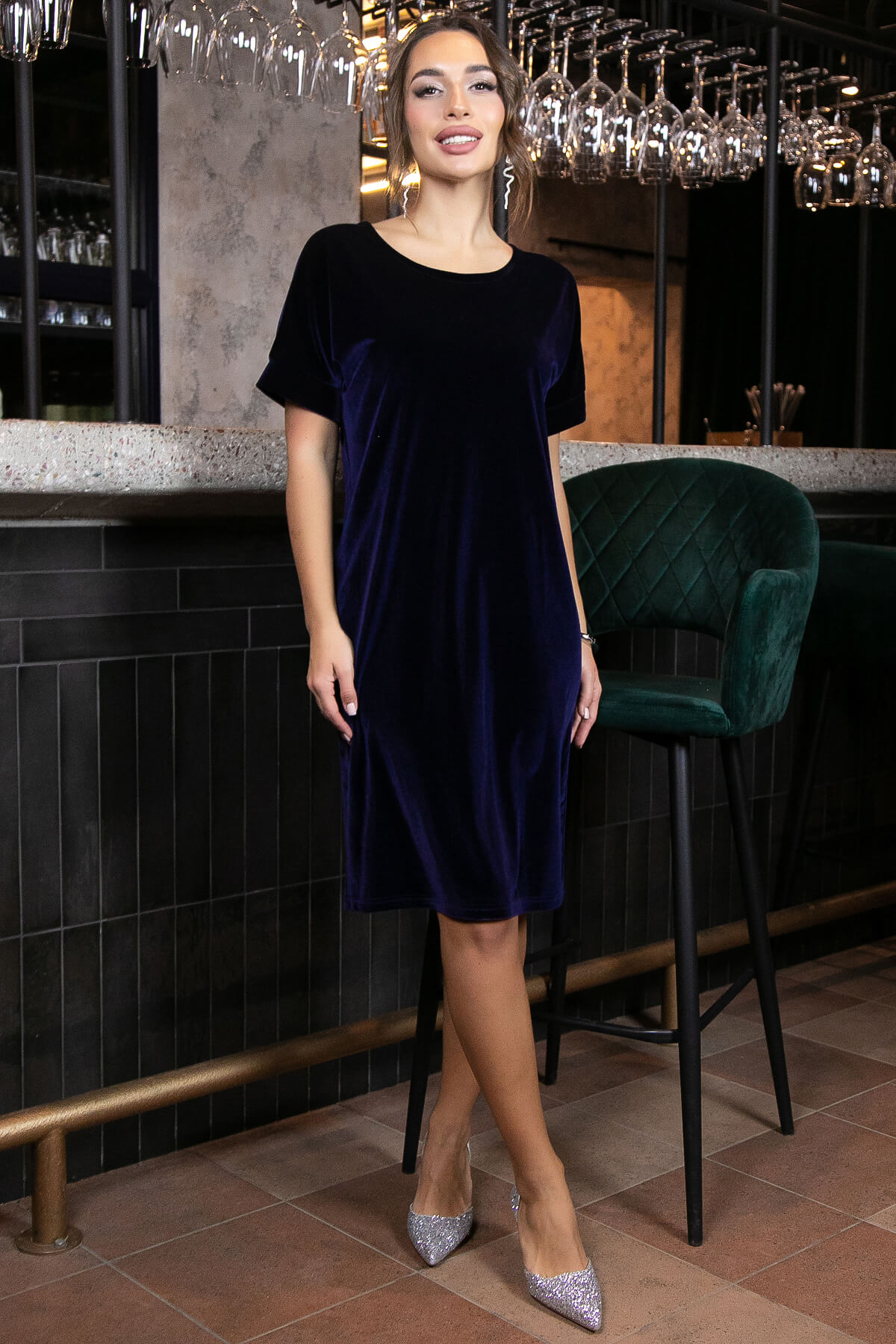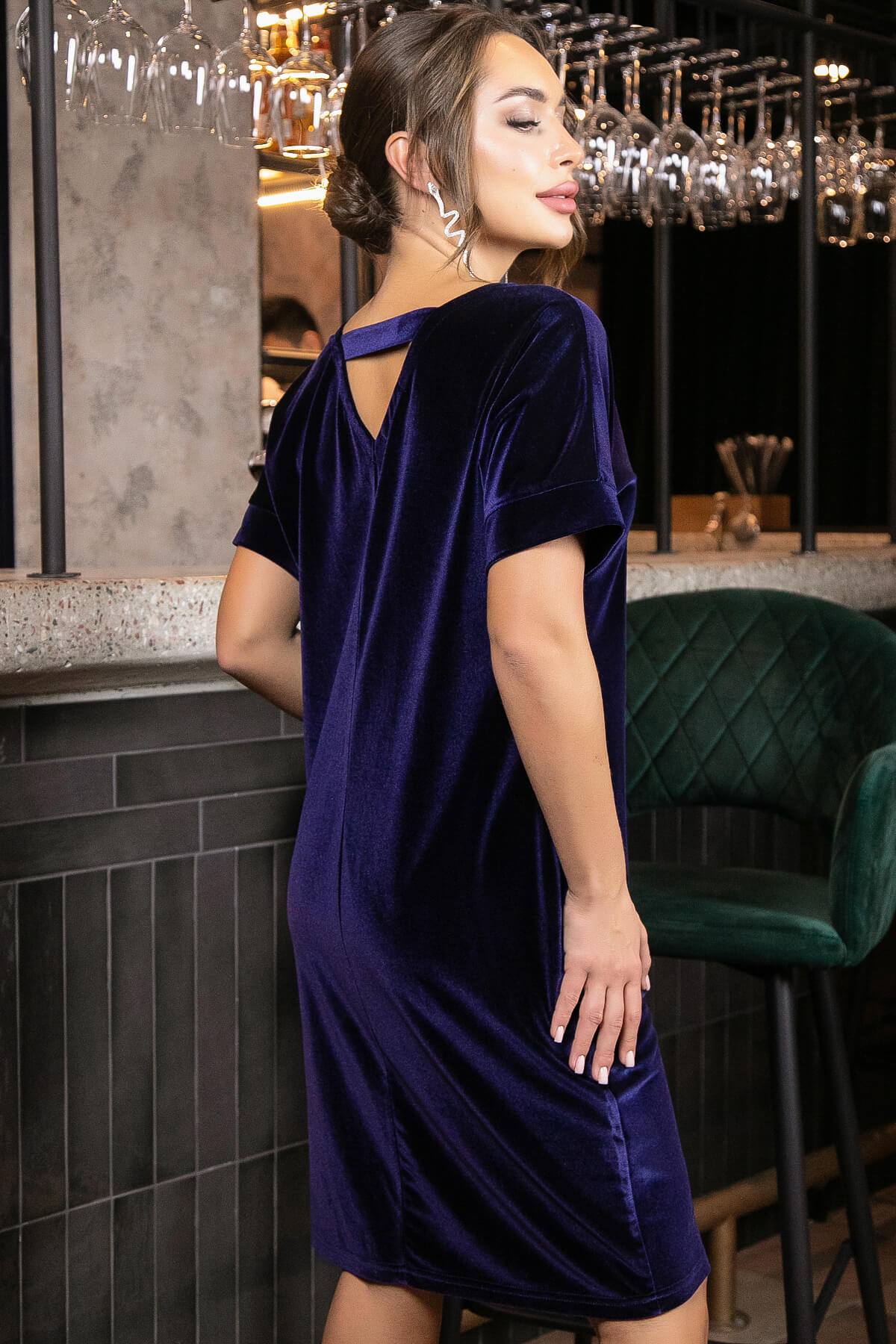 Почувствуйте себя королевой в этом тёмно-синем платье! По спинке выполнен декоративный вырез, акцентирующий внимание на вашем образе. Рукав цельнокроеный короткий с манжетой по низу подходит абсолютно для любого типа и телосложения фигуры и скрывает недостатки.