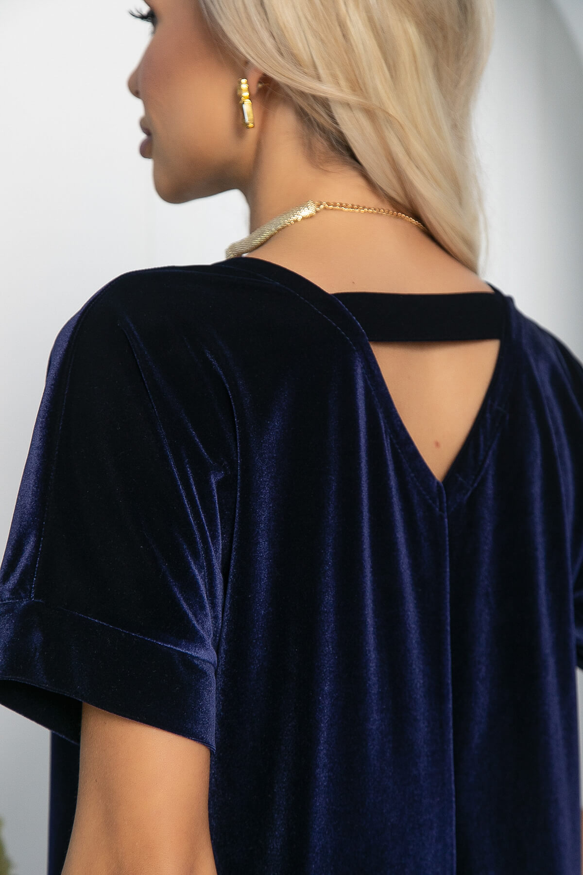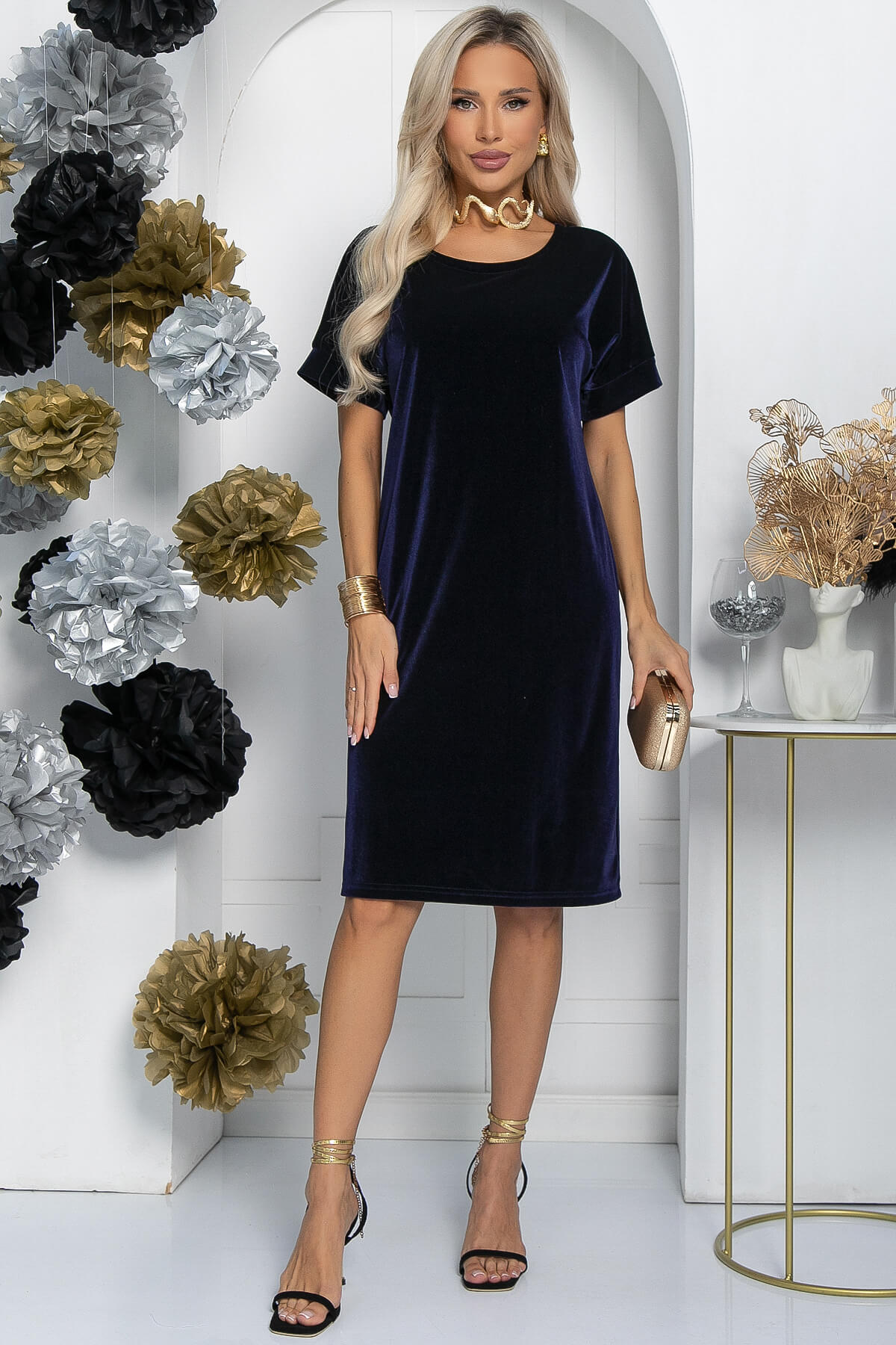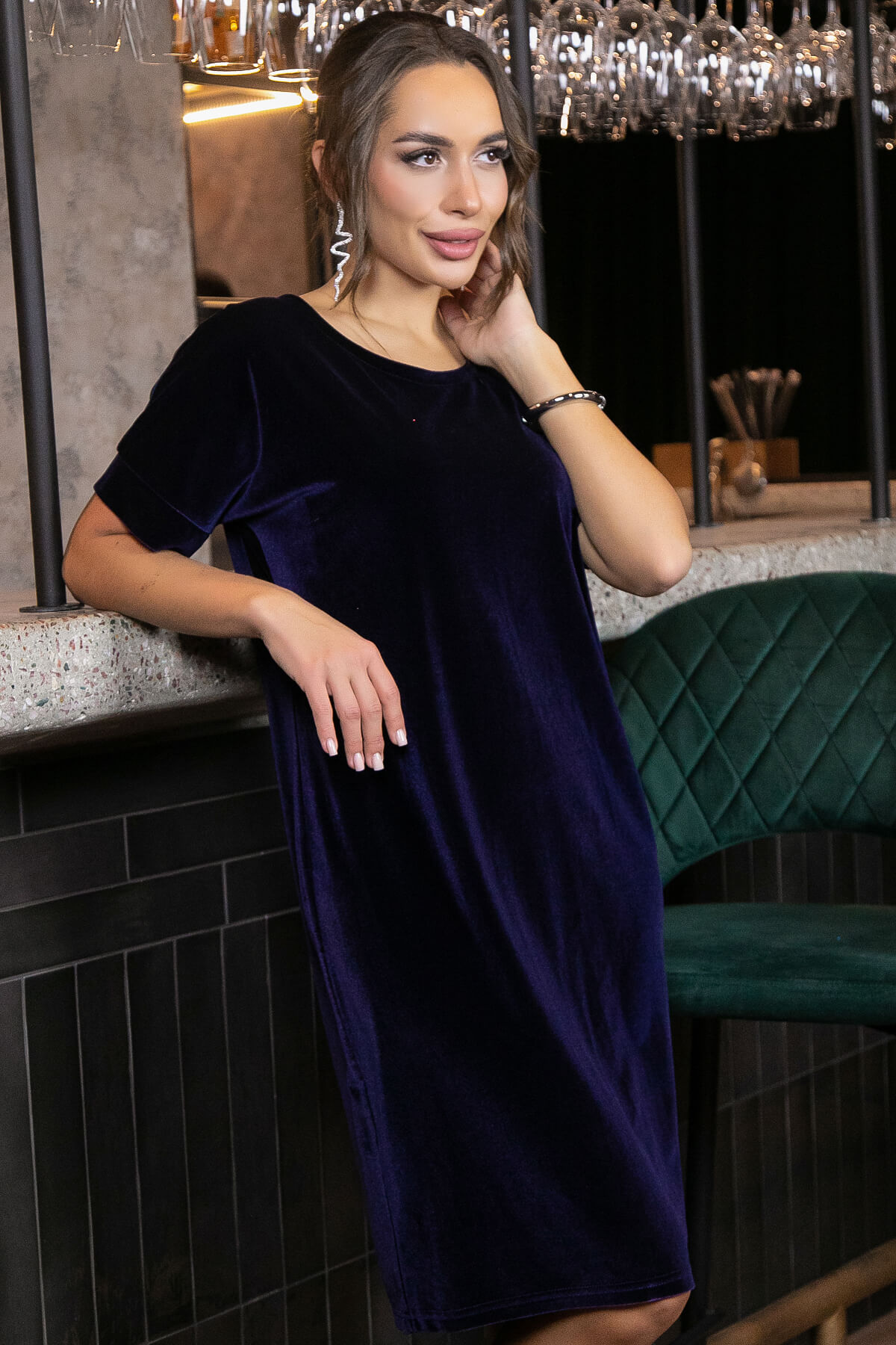 Почувствуйте себя королевой в этом тёмно-синем платье! По спинке выполнен декоративный вырез, акцентирующий внимание на вашем образе. Рукав цельнокроеный короткий с манжетой по низу подходит абсолютно для любого типа и телосложения фигуры и скрывает недостатки.