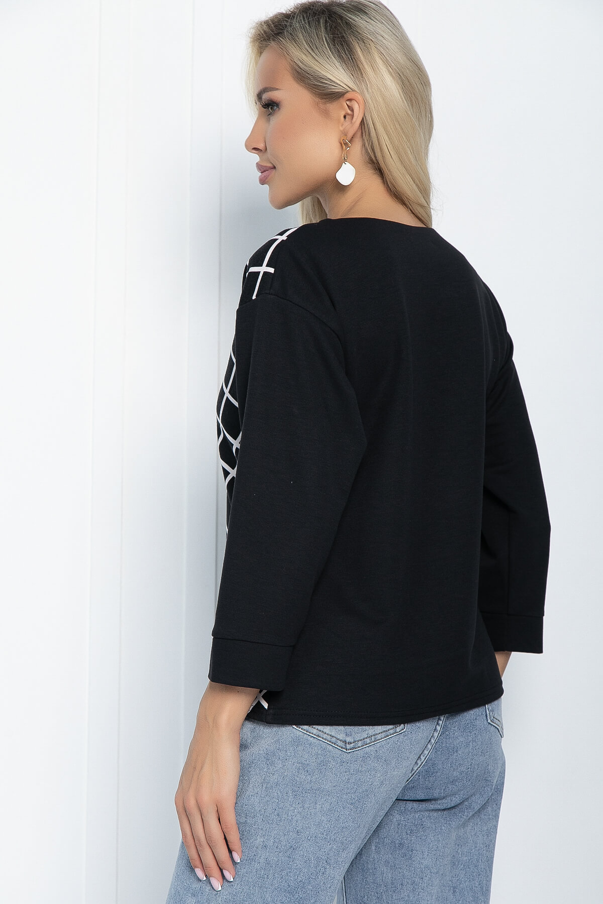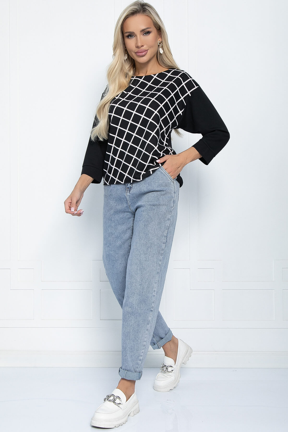 Трикотажный джемпер в клетку — это универсальный предмет гардероба, который подойдёт для создания как повседневных, так и нарядных образов. Передняя часть изделия украшена принтом, а спинка и рукава выполнены в однотонном цвете. Горловина округлая. Джемпер имеет прямой крой с втачным рукавом длиной 3/4 с манжетами.