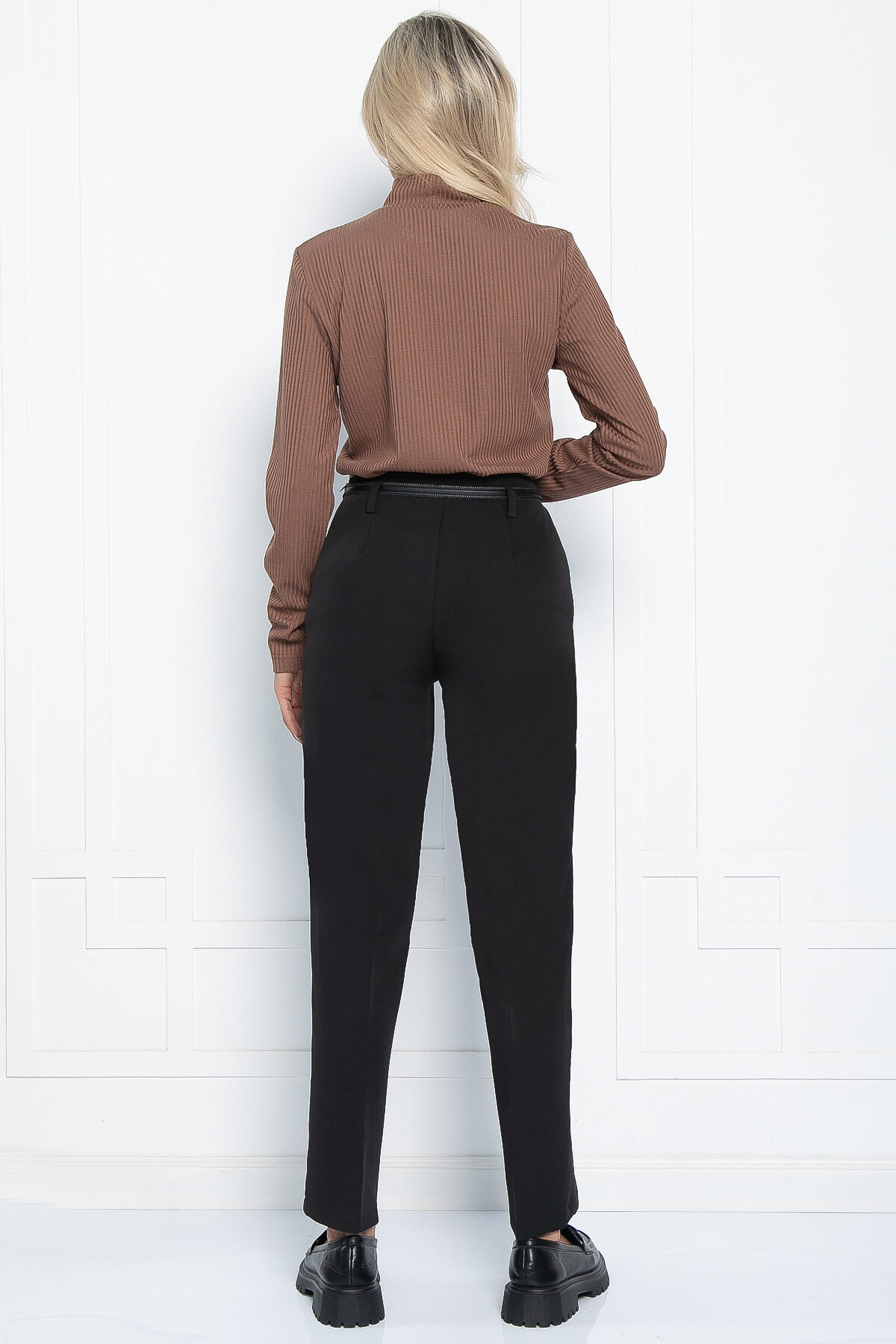 Классические чёрные брюки, по переду изделия имеются стрелки, что визуально правильно вытянет силуэт и сделает фигуру стройнее. Сбоку потайная молния. Вариант для офисных будней в классических образах. Так же актуально будет смотреться с водолазкой или свитеров в повседневных вариантах. Ремень чёрный из экокожи в комплекте.