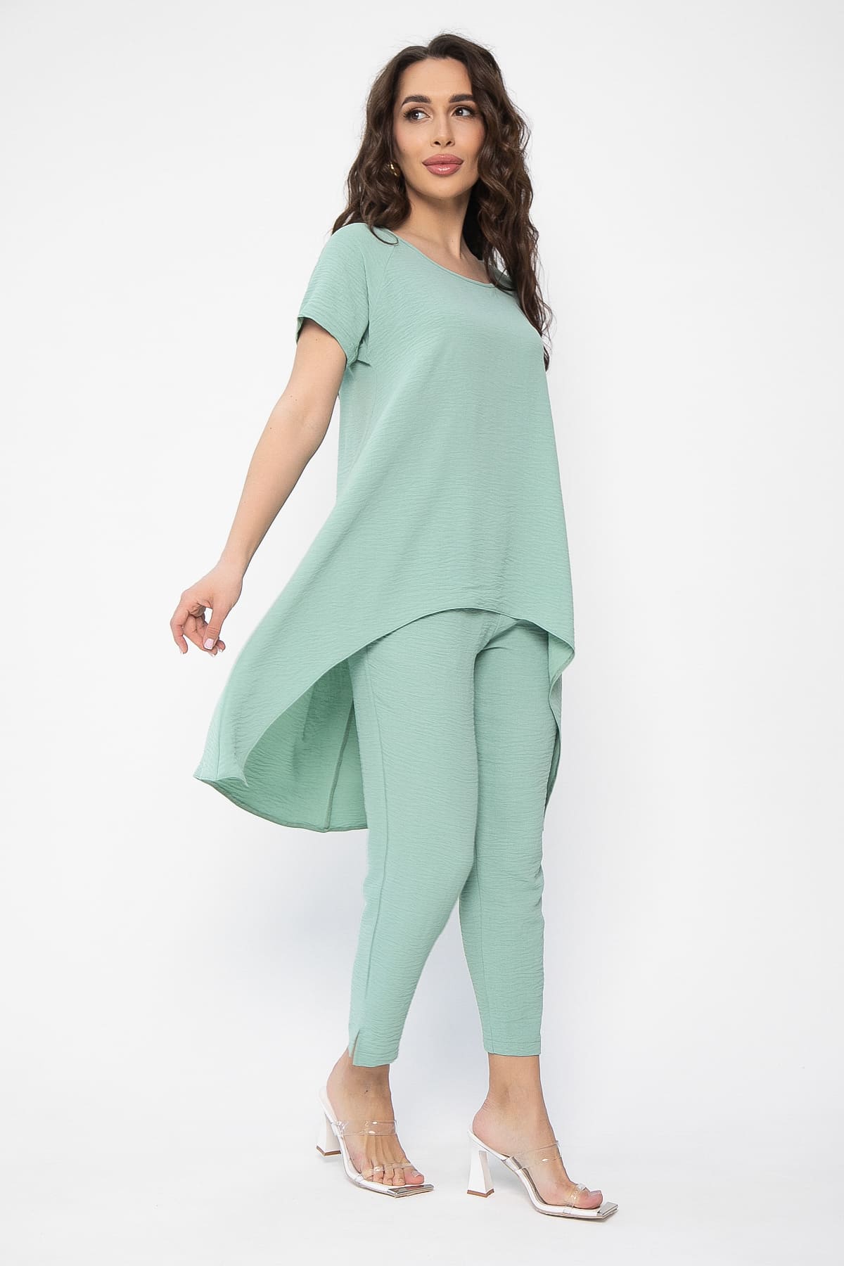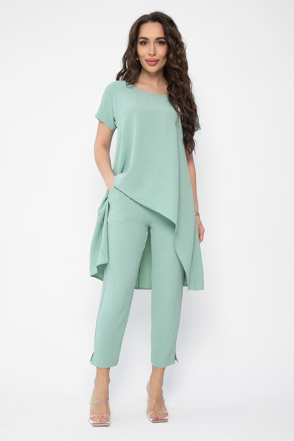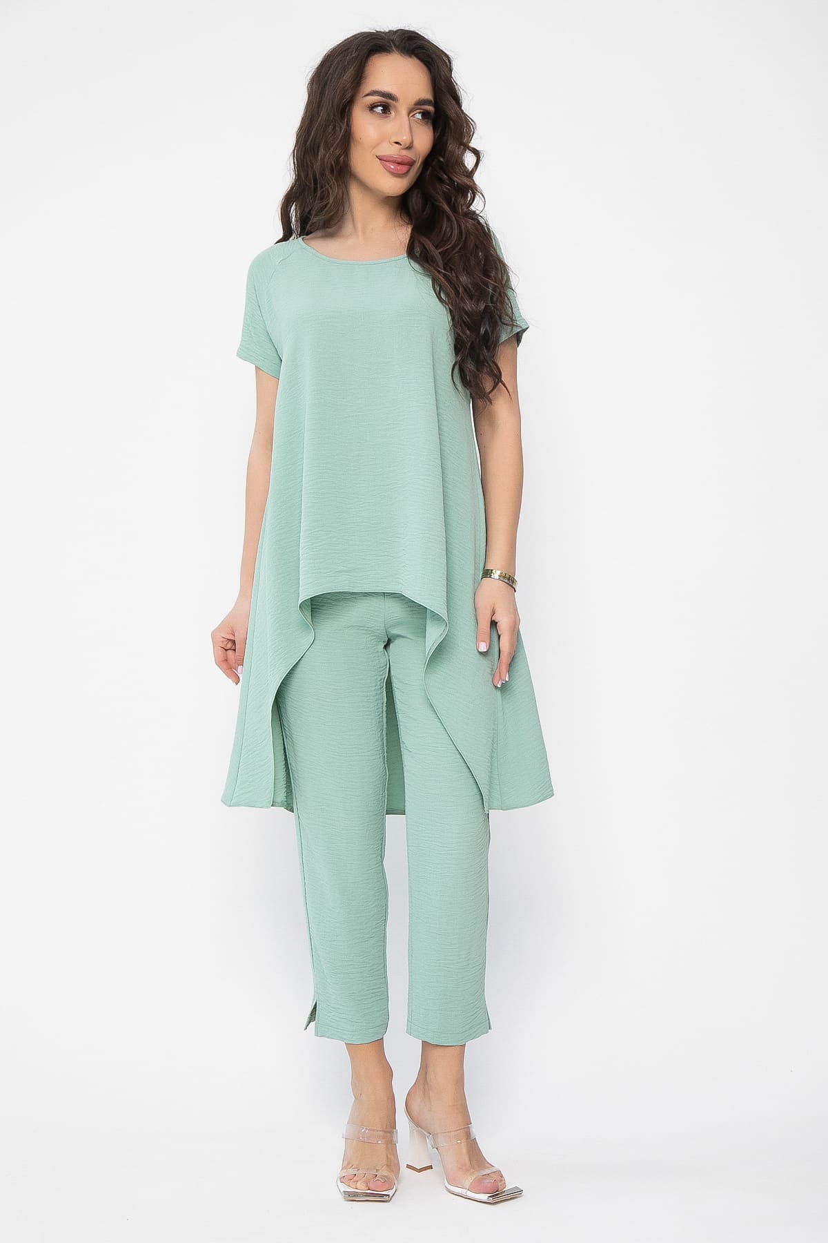 С этим комплектом вы будете ощущать себя комфортно, независимо от того, где вы находитесь. Необычный фасон придаст свежести вашему летнему гардеробу. Костюм состоит из туники и укороченных брюк! Брюки заужены к низу, по бокам снизу разрезы, карманы в боковых швах, талия на резинке. Туника А-силуэта с асимметричным низом, рукав кроя «реглан».