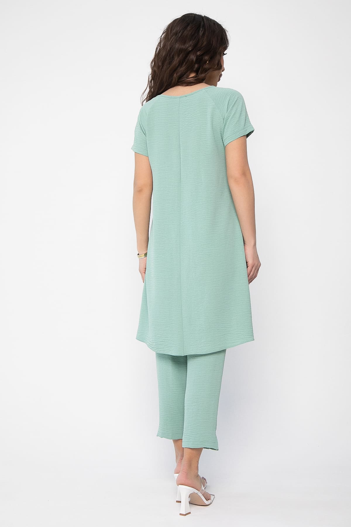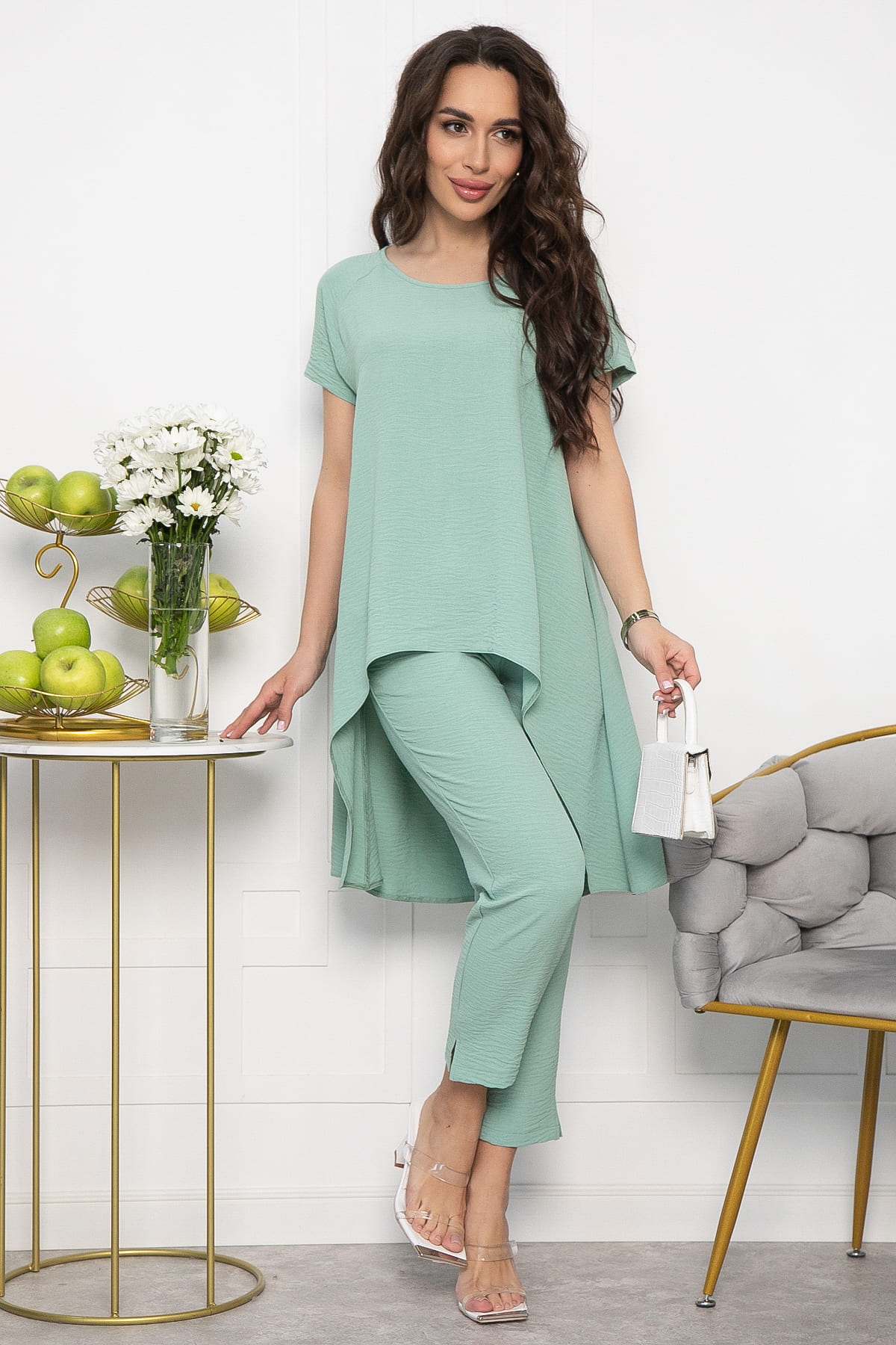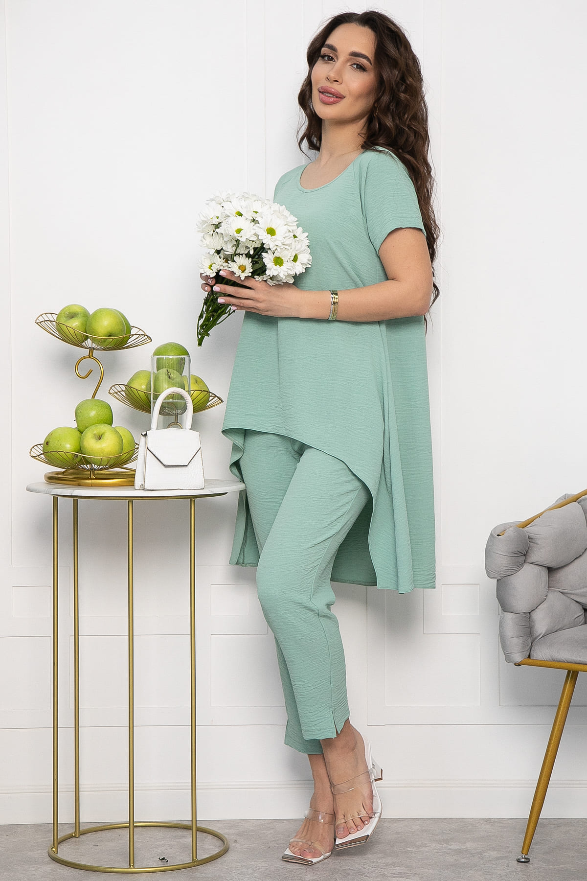 С этим комплектом вы будете ощущать себя комфортно, независимо от того, где вы находитесь. Необычный фасон придаст свежести вашему летнему гардеробу. Костюм состоит из туники и укороченных брюк! Брюки заужены к низу, по бокам снизу разрезы, карманы в боковых швах, талия на резинке. Туника А-силуэта с асимметричным низом, рукав кроя «реглан».
